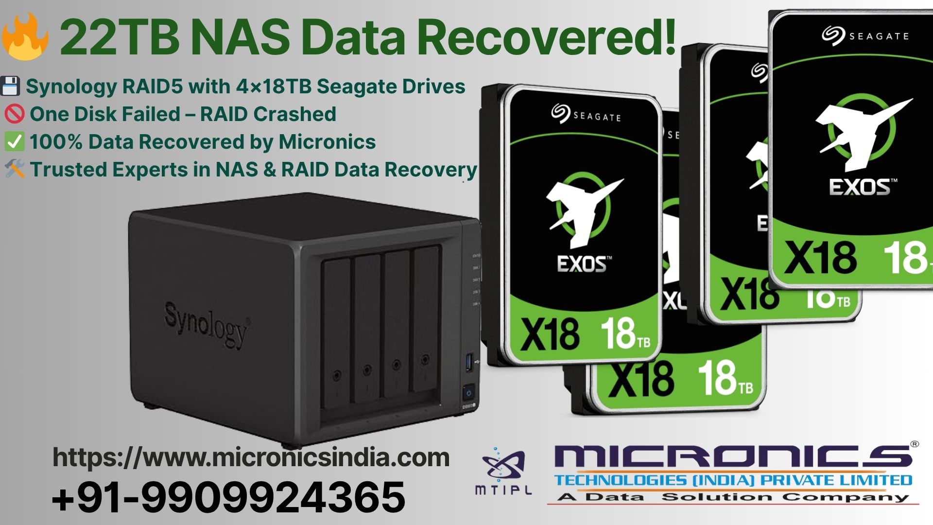 Customer reported that their Synology NAS unit became unresponsive, and one of the 18TB Seagate Exos drives was no longer detected. The RAID5 array failed, making the entire data volume inaccessible. Critical business data was stored on the NAS, with no recent backup available.